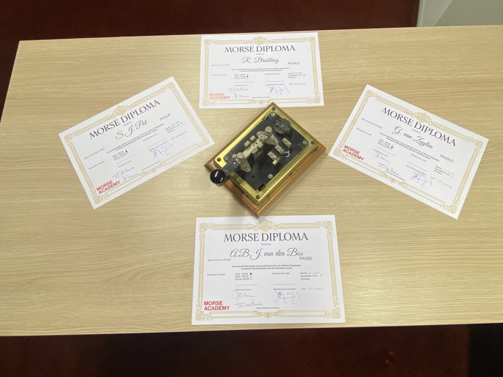 Na afloop worden er 4 diploma’s ondertekend door Edward (PE1EEF, voorzitter) en de twee examinatoren Derk (PA2DW) en Dick (PA3CW) en door Edward uitgereikt. Na afloop nog een foto van het hele team bij de boeg van de SS Rotterdam. Een mooie reis op de SS Rotterdam komt voor een aantal ten einde. De morsevaardigheid plus alle mooie opleidingsonderdelen over techniek, cultureel erfgoed, historie en contest techniek hebben het cursusjaar compleet gemaakt. We zien de meesten van jullie met plezier weer terug volgend jaar, om de morse vaardigheid te vergroten of om meer vertrouwen te krijgen in de procedures op de amateurbanden!
