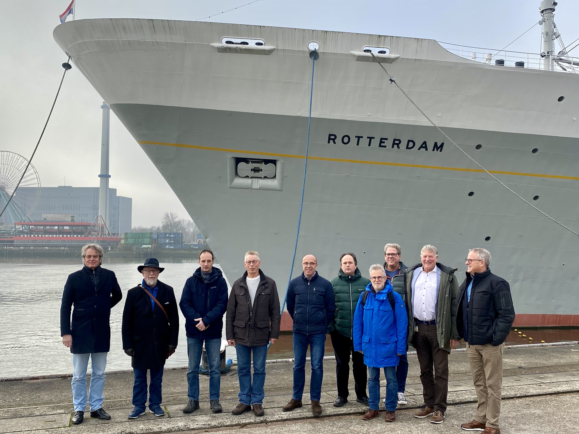 Na afloop worden er 4 diploma’s ondertekend door Edward (PE1EEF, voorzitter) en de twee examinatoren Derk (PA2DW) en Dick (PA3CW) en door Edward uitgereikt. Na afloop nog een foto van het hele team bij de boeg van de SS Rotterdam. Een mooie reis op de SS Rotterdam komt voor een aantal ten einde. De morsevaardigheid plus alle mooie opleidingsonderdelen over techniek, cultureel erfgoed, historie en contest techniek hebben het cursusjaar compleet gemaakt. We zien de meesten van jullie met plezier weer terug volgend jaar, om de morse vaardigheid te vergroten of om meer vertrouwen te krijgen in de procedures op de amateurbanden!